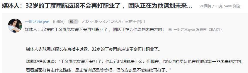 根据媒体人“球圈赵探长”在直播中透露的消息,32岁的丁彦雨航应该不会再打职业了,这也就意味着丁彦雨航将正式告别CBA赛场。丁彦雨航的团队也在帮他谋划一些未来的方向,未来有可能向培训等方向进行发展。丁彦雨航作为CBA昔日连续两届常规赛MVP,最终因为伤病的影响开始走下坡路,上赛季虽然加盟广州男篮,但是因为两次体测没能通过,最终无缘重返CBA。丁彦雨航目前的身体状态已经很难再打职业,提前退役,转型其他赛道对他来说才是最佳选择。